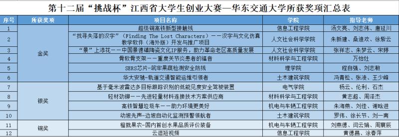 乘风破浪十五载,敢闯会创建新功。8月23日,第十二届“挑战杯”江西省大学生创业大赛终审决赛落幕。华东交通大学选送的12个项目经过资格审查、省级复赛、视频公开答辩和组委会、评委会综合审定,脱颖而出,获6金4银2铜的优异成绩,团体总分位列全省第二,并荣获“优胜杯”“优秀组织奖”,创该校参加此项赛事以来历史最好成绩。