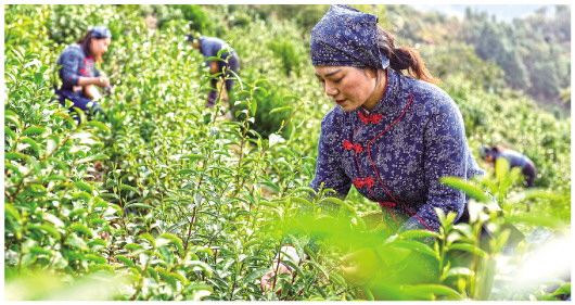 ↑茶农在浮梁县西湖乡桃墅村杨石组高山生态茶园采茶。程万海摄