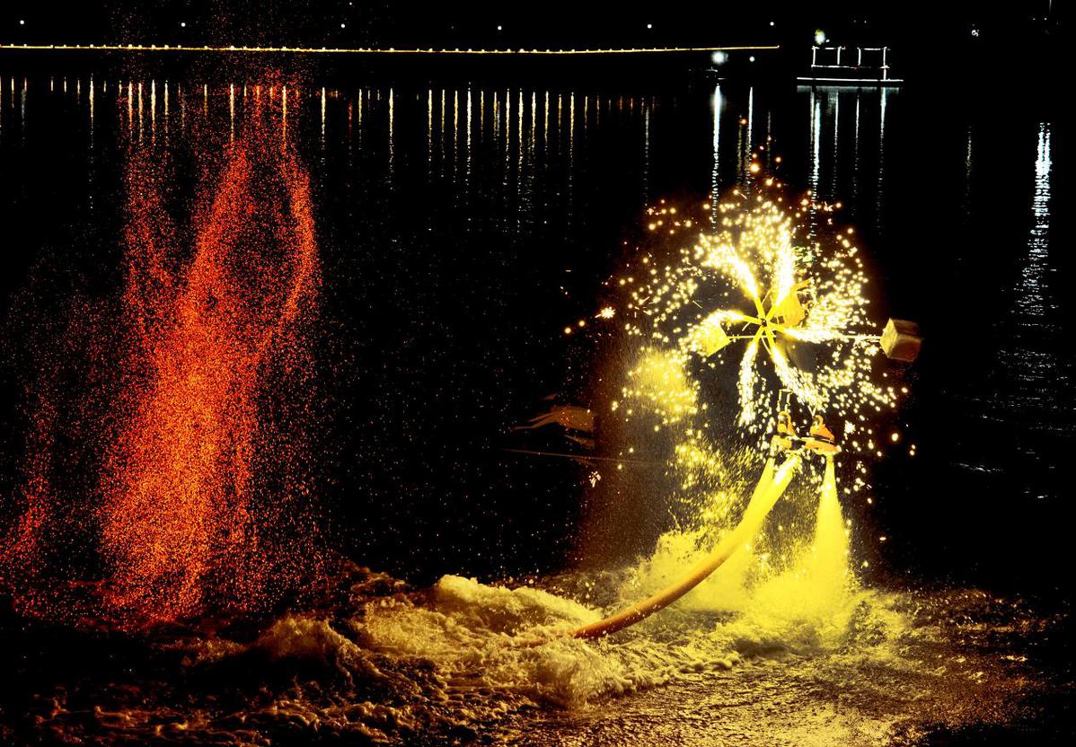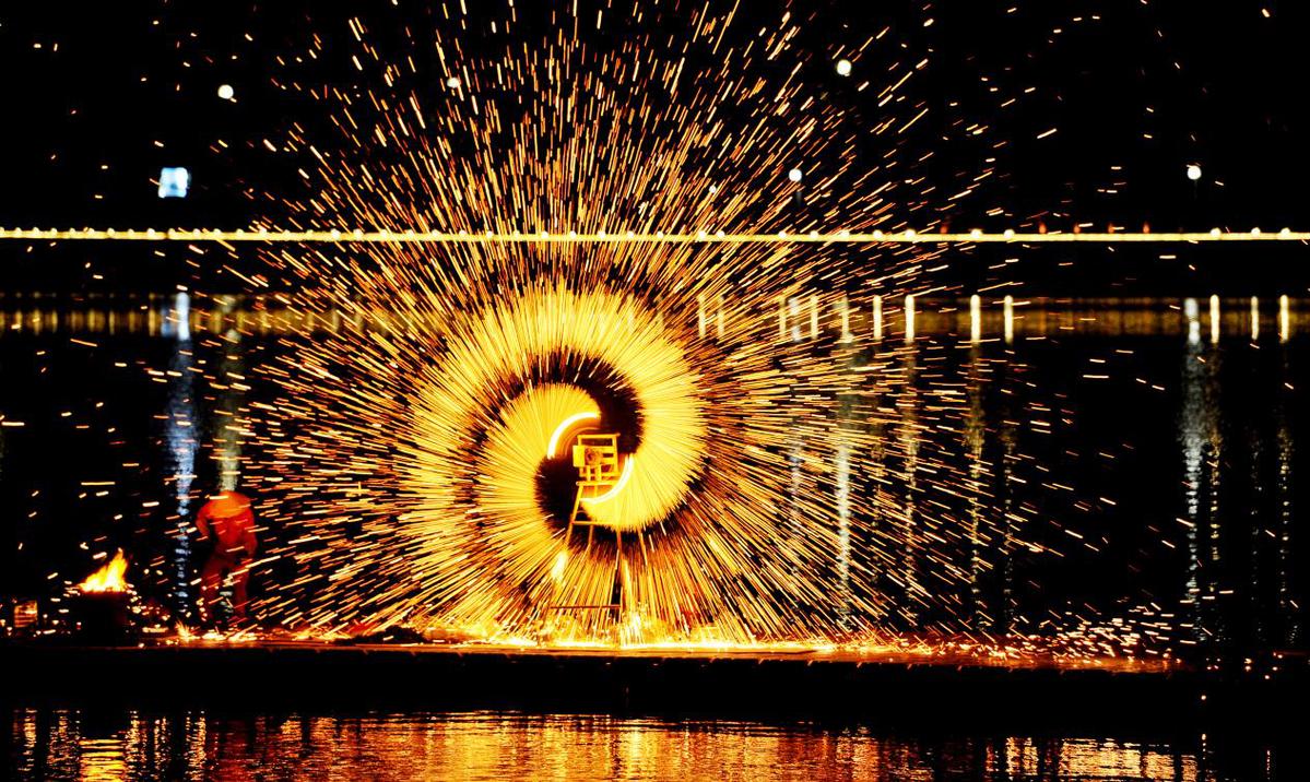 10月1日,在江西省德兴市凤凰湖,非遗打铁花改良版的水上“风火轮”表演堪称视觉盛宴,为国庆假期增添了几份浓烈的喜庆色彩。