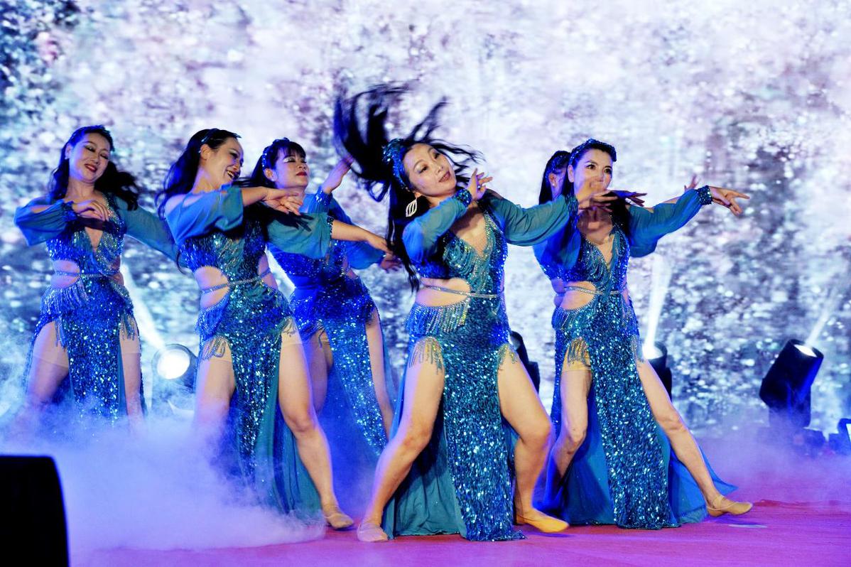 10月1日,在江西省德兴市凤凰湖畔,来自该市本土的东方舞《星河曼舞》以柔美舞姿演绎别样风情。