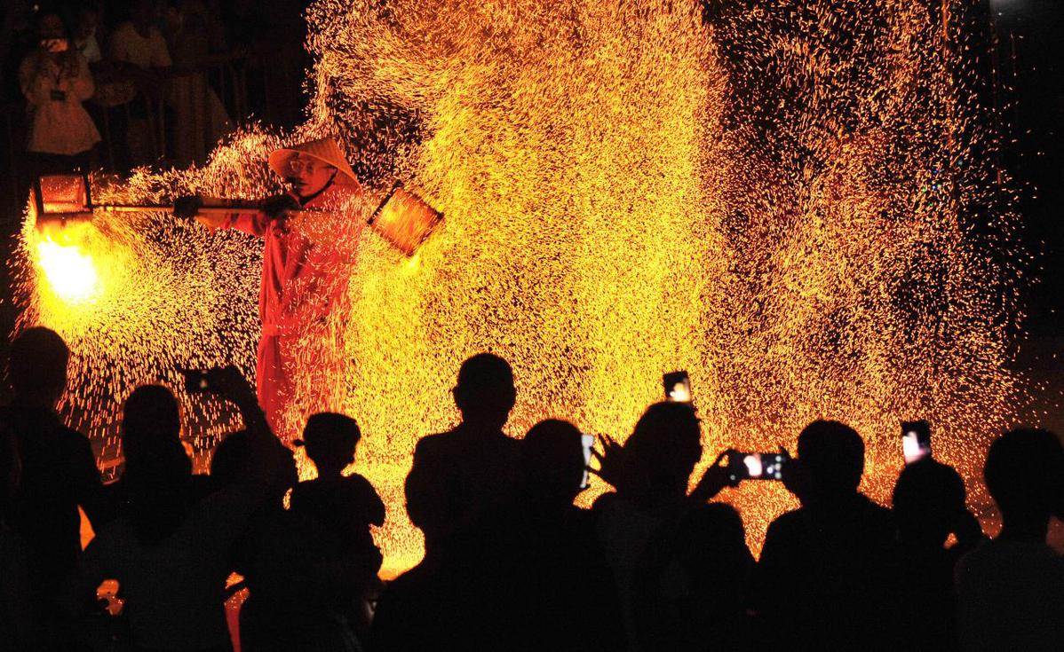 10月1日,在江西省德兴市凤凰湖畔,非遗展示“火壶”表演,以其精湛技艺操控烈焰,为当地群众送上了丰厚的视觉盛宴。