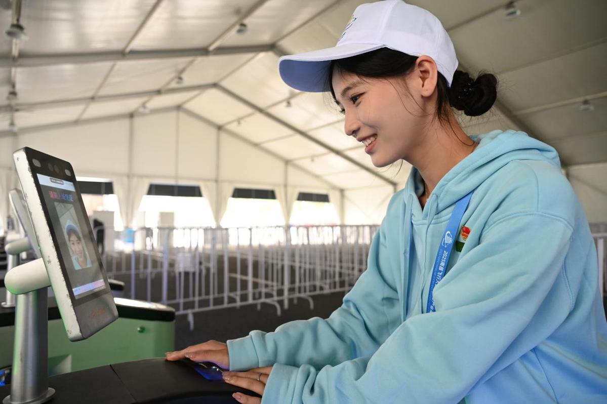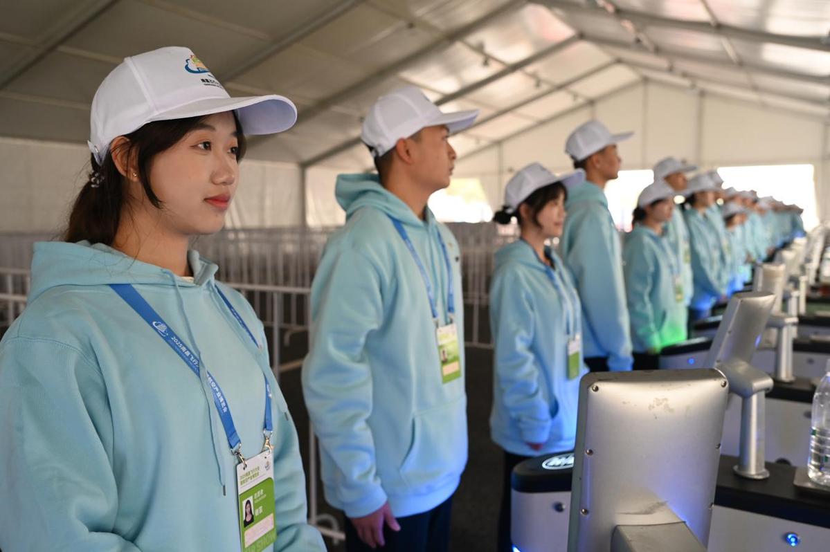 10月30日,2025南昌飞行大会“小白鹤”青年志愿者、江西现代职业技术学院文化旅游学院学生刘钰滢反复在闸机检票处演练群众进场时的响应动作、礼仪举止、话术引导等细节。