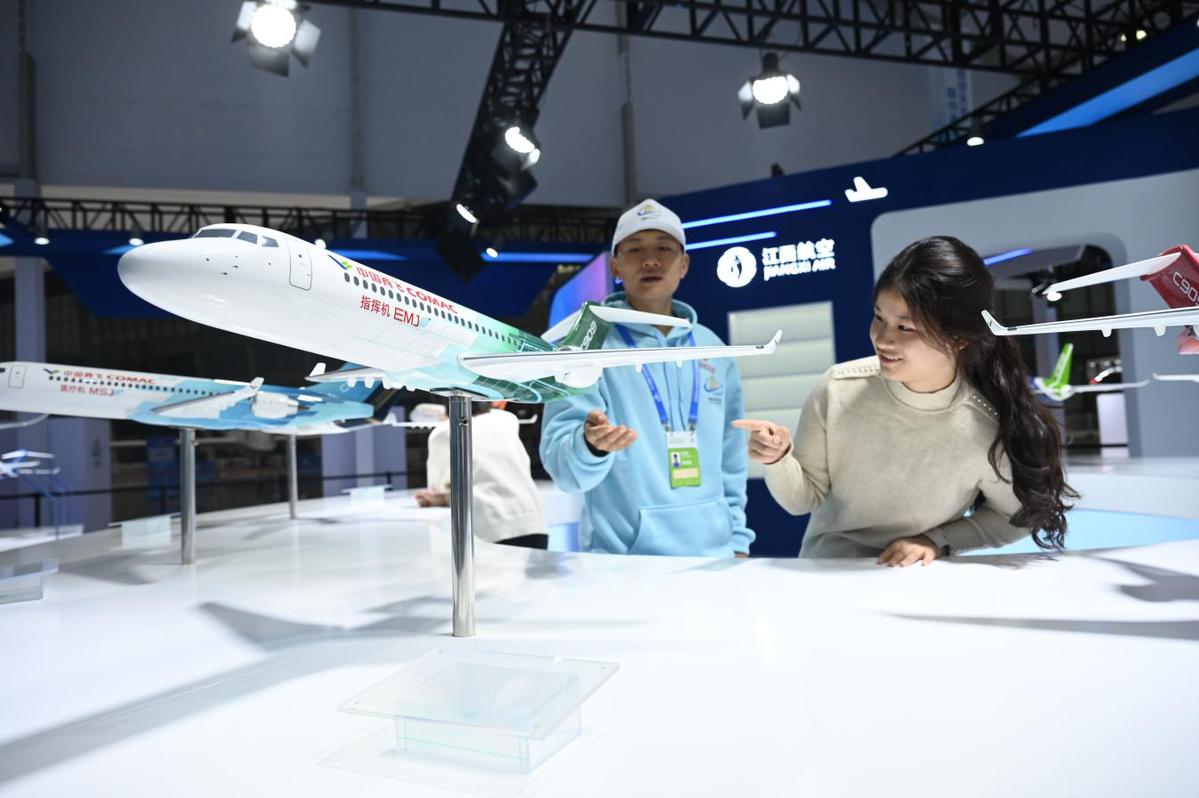 10月30日,江西航空职业技术学院的“小白鹤”青年志愿者在2025南昌飞行大会航空展厅向群众介绍国产C909、C910飞机模型,志愿者们运用所学专业知识,向广大市民生动讲述了我国民用航空工业的创新与发展,成为连接尖端航空科技与公众认知的桥梁。