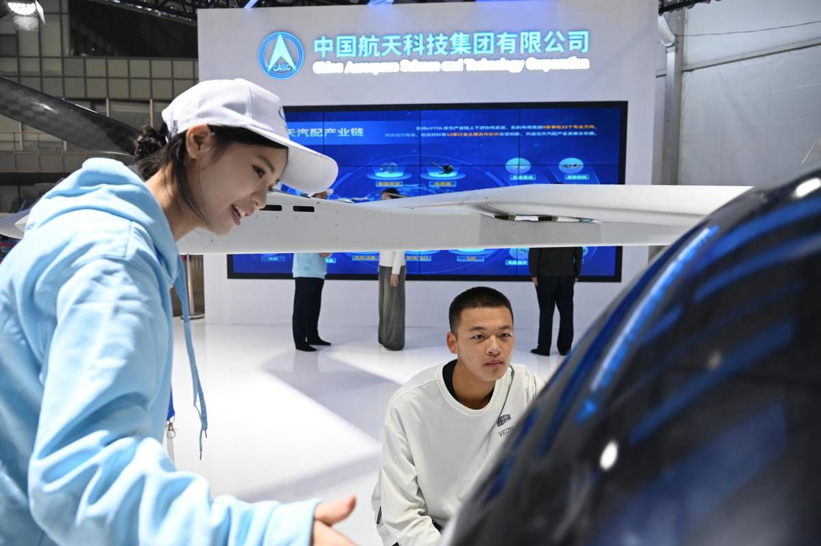 10月30日,江西现代职业技术学院的“小白鹤”青年志愿者在2025南昌飞行大会航空展厅向群众介绍国产无人机系列产品,让“中国智造”的骄傲感,随着他们的讲解,飞入寻常百姓家。