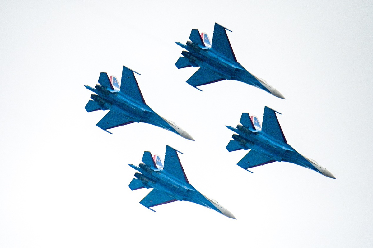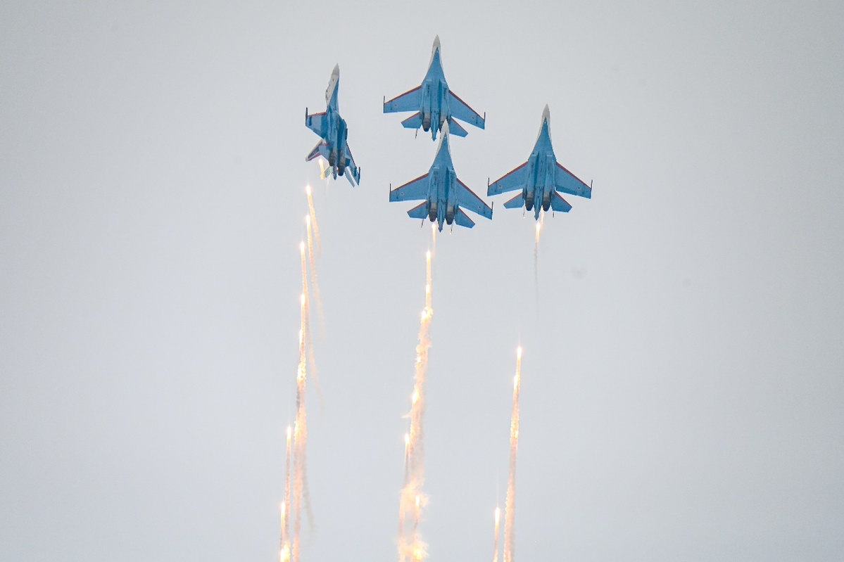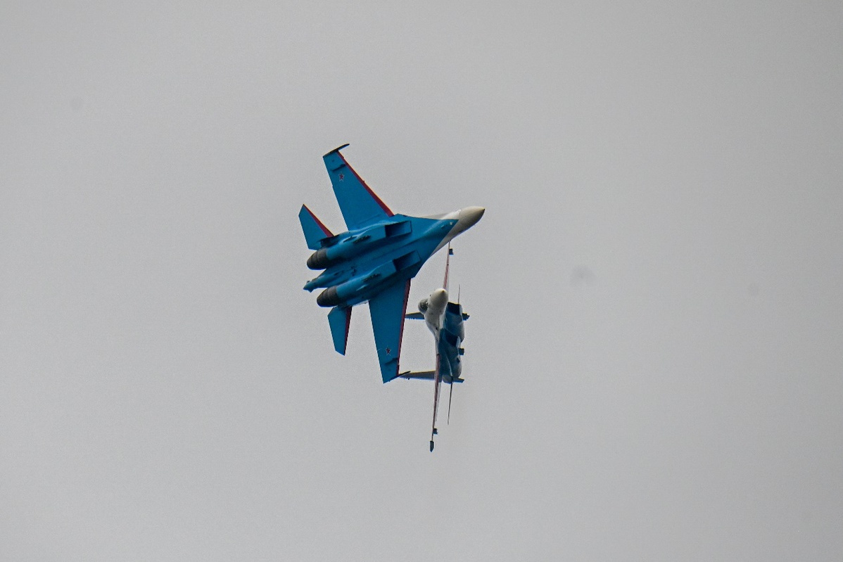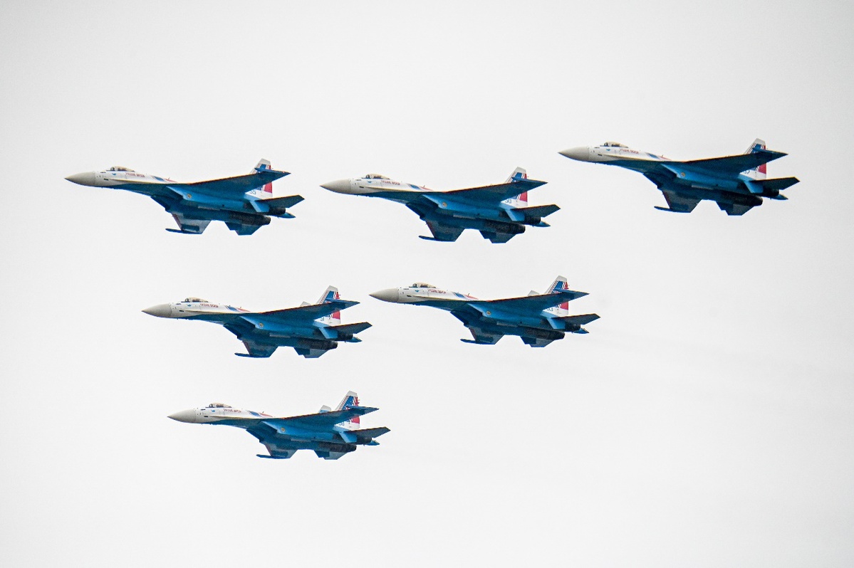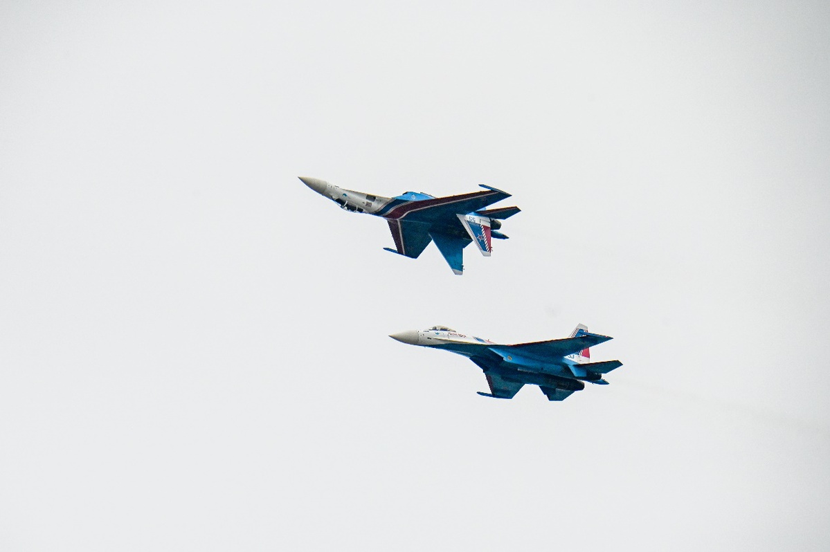 俄罗斯“勇士”飞行表演队驾驶苏-35S等重型战斗机,上演“落叶飘”“眼镜蛇机动”等经典高难度动作,为观众带来一场震撼的视觉盛宴。