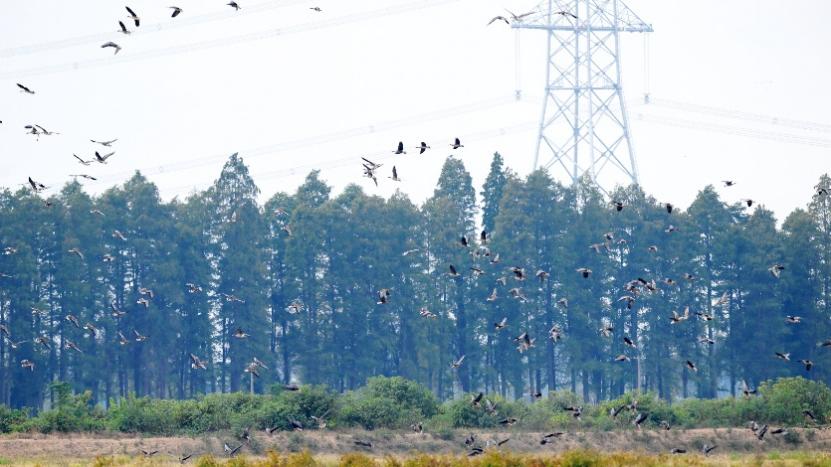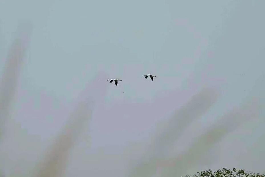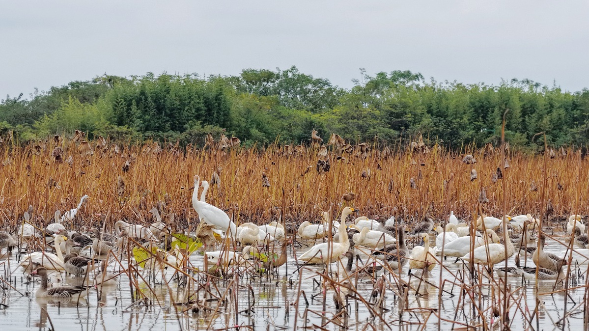 11月3日清晨,南昌高新区鲤鱼洲五星白鹤保护中心的藕田上空,两道洁白身影划破晨雾——两只白鹤舒展双翼翩然降落,成为今年鄱阳湖区观测到的首批白鹤访客。4日,它们踱步至收割后的稻田中安然觅食,细长的喙轻啄地面,与金黄田垄、远处林木构成一幅静谧祥和的田园画卷;5日,这对 “先行者” 正式停栖藕田,与早已在此等候的小天鹅、灰雁、白额雁、白鹭等水鸟会合,时而低空盘旋、时而浅水嬉戏,群鸟齐飞的灵动景致,为观鸟季写下生动开篇。自2012年起,鲤鱼洲湘子口的藕田便成为白鹤越冬的“心头好”,年年如期赴约的身影,见证着这片栖息地始终不变的生态坚守。