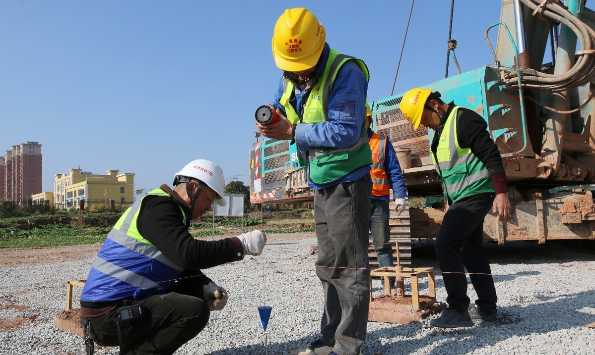 在长赣高铁吉安遂川段遂川江特大桥施工现场,大型旋挖钻机有序作业,工程车辆往来穿梭,施工人员分工明确、紧张作业。一根根桩基稳步成孔入地,各道工序衔接紧密,现场秩序井然。
